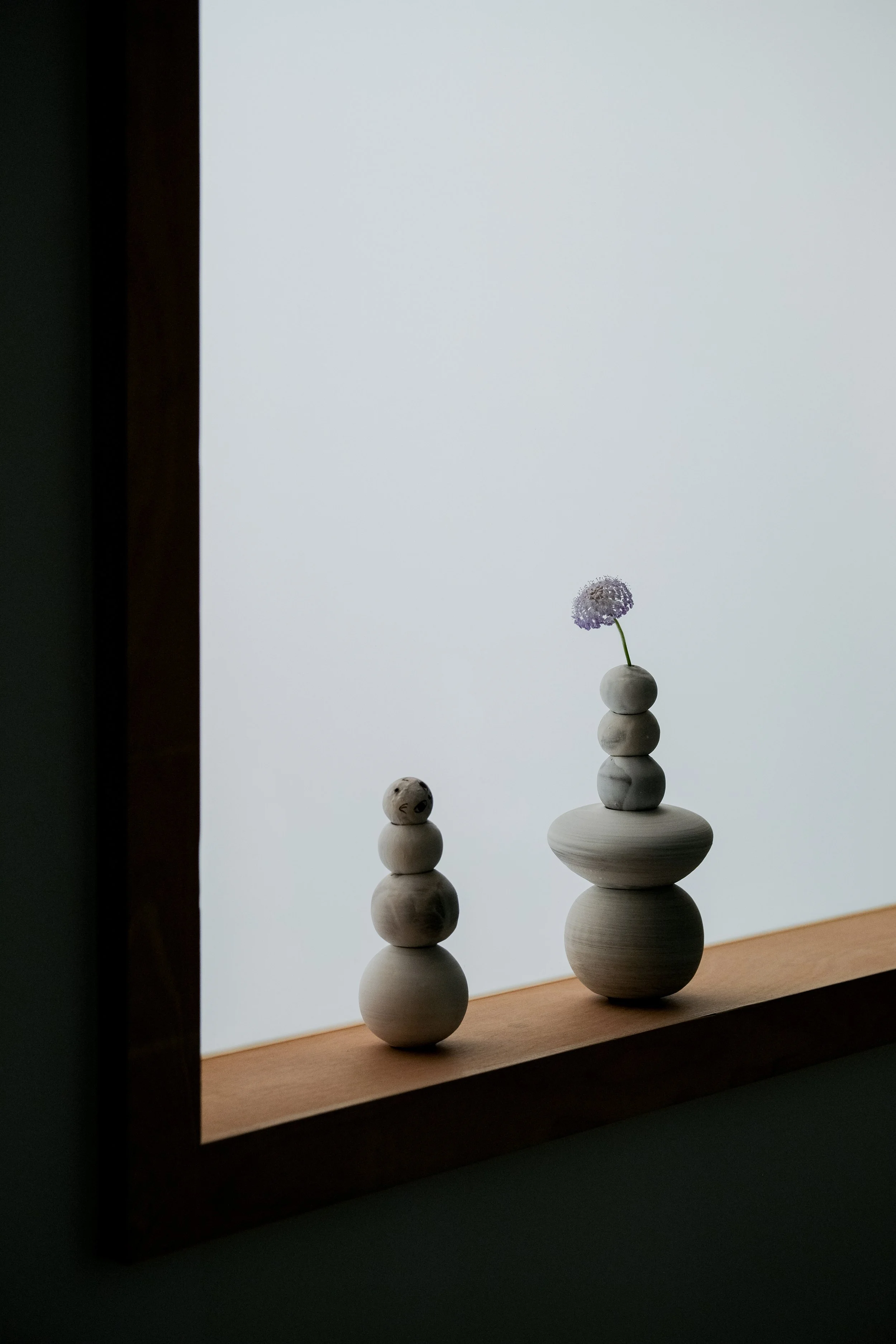 Everything begins with a circle. Forms evolve through variations in size, angle, proportion, and rhythm, becoming orbs or vessels. The units share a common structure yet remain individually distinct, much like people. Designed to be stacked and exchanged, their outlines curve with the viewing angle and return to the circle from above. Formed in clay and finished with layered slip instead of glaze, the surfaces retain a raw, tactile quality. Within an iterative system, ceramic practice and life operate continuously.