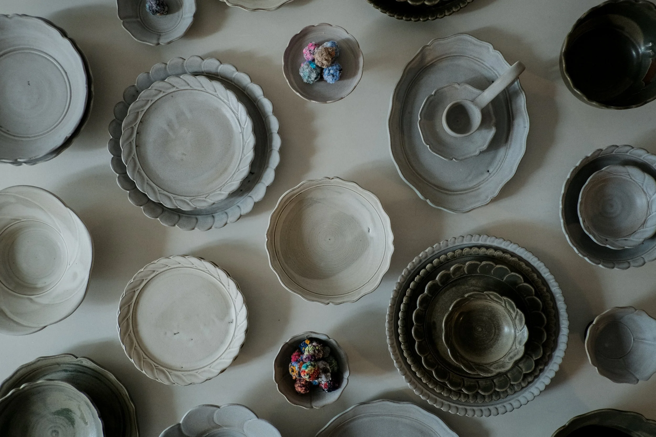 一切從圓開始。從圓出發,依尺寸、角度、比例與節奏變化、重組,形成球體或器皿。單元結構看似相同,又彼此相異,如同人。可被堆疊、替換的作品,輪廓隨視角曲行,而在俯視之下,仍回到圓。以土塑型,覆上化妝土以取代釉藥,還原土坯最真實的感性。在反覆生成之中,製陶與人生都像一套持續運作的系統。