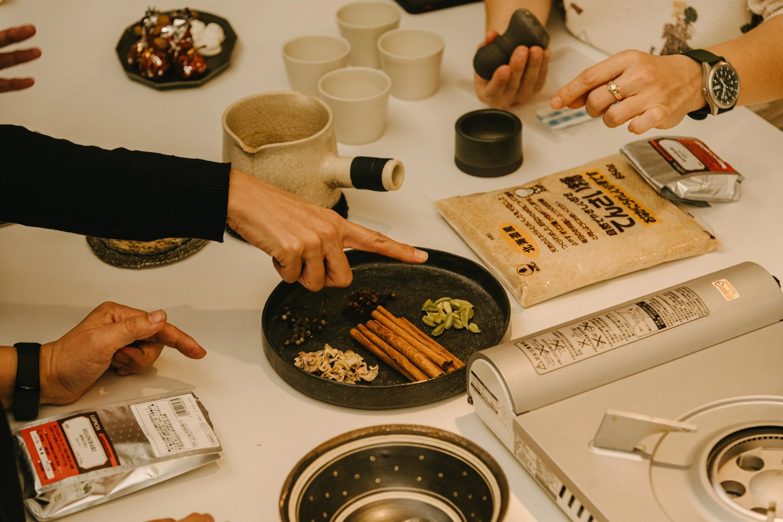 也帶了近十種自己最喜歡的香料、甜點,藉由工作坊帶大家認識各式香料的特性、氣味,再親手用 YULABO 現場展出的陶器皿,親手慢慢磨製、烹煮出屬於自己的香料茶。
